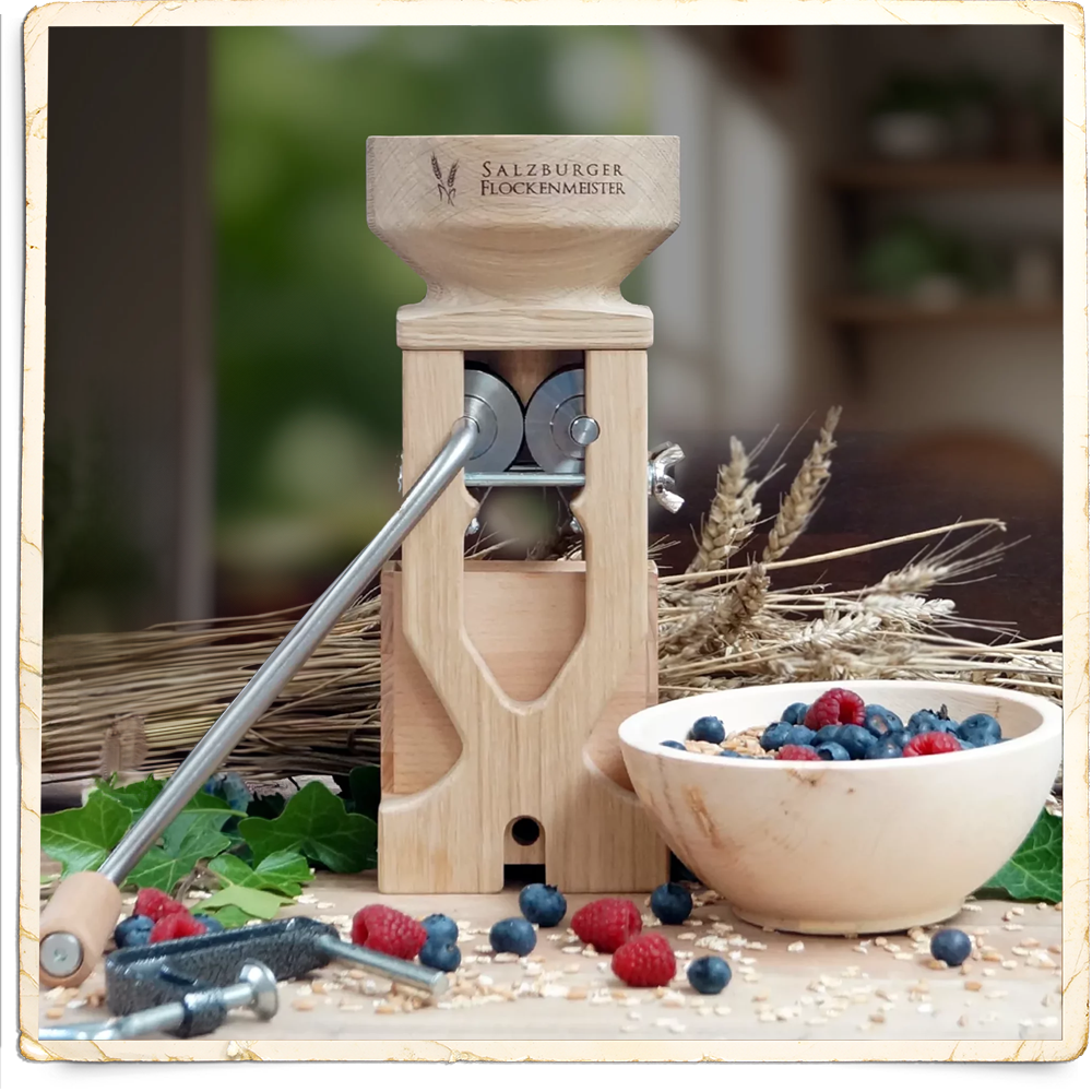 The housing of the flake squeezer is made from solid, local beech wood by an Austrian master craftsman.
